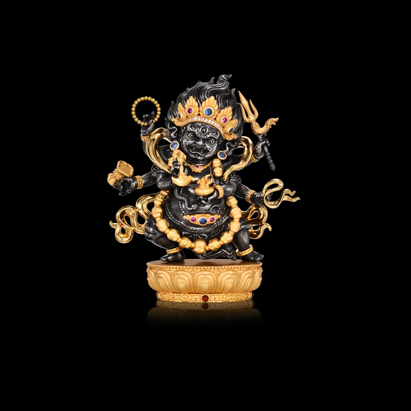 In Tibetan Buddhism, the six-armed Mahakala is the guardian god of war of the Dharma: he appears in a wrathful form, holding a trident (to subdue demons), a skull bowl (to transform troubles into wisdom), a dharma wheel (the constant rotation of the Dharma), rosary beads (to break the bondage of reincarnation), a conch shell (to bless all beings), and a vase (to gather wealth). He vows to "dispel obstacles to practice, protect believers in gaining wealth and power", and is the "guardian god of war" that has been passed down in Tibet for thousands of years.