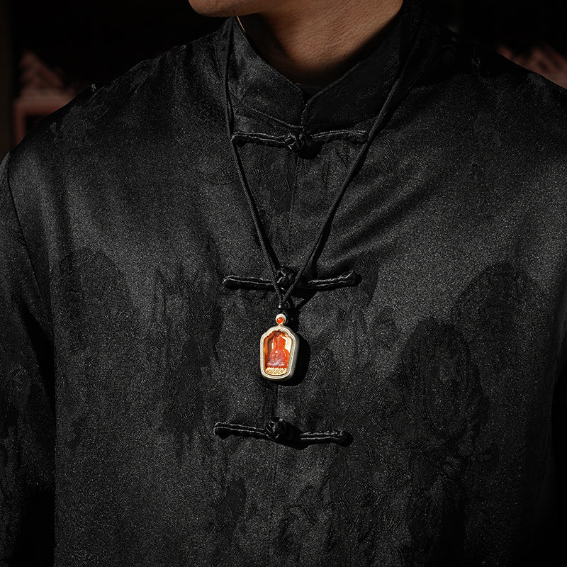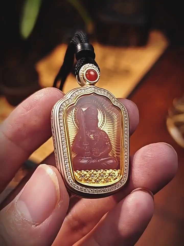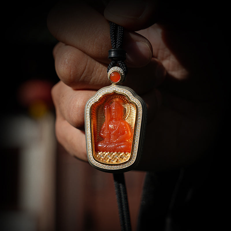 Manjushri Bodhisattva, a Buddhist deity symbolizing wisdom and eloquence, is said to wield a sword of wisdom that severs the defilements of all beings, protecting students and guiding them through delusion. For millennia, the belief in Manjushri's protection has been passed down orally. This pendant, crafted from the warm, gentle southern red stone and inlaid with gold and diamonds, captures this millennia-old wisdom and protection with modern craftsmanship, bringing this ancient power into our daily lives.