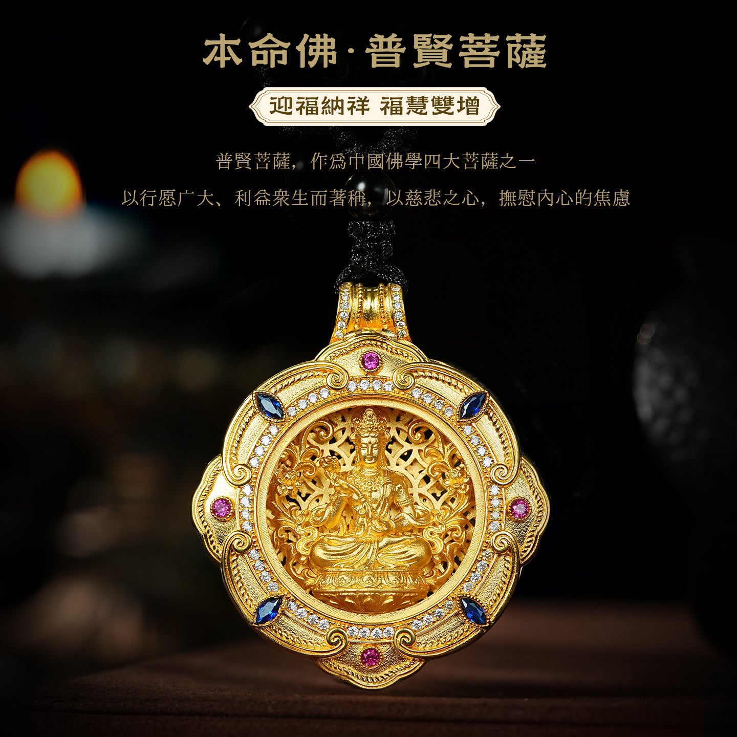 Samantabhadra Bodhisattva was chosen as the design inspiration because he represents both "practice" and "wisdom"—his compassion can soothe inner anxiety, and his spirit of "practice" can inspire people to pursue righteousness. The pendant, with a gold base and gemstones, combines traditional religious symbols with high-end craftsmanship. While preserving the sacred core of Buddhist culture, its refined appearance aligns with contemporary aesthetics, making faith a constant companion and a source of spiritual strength.