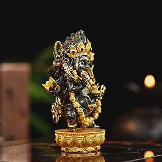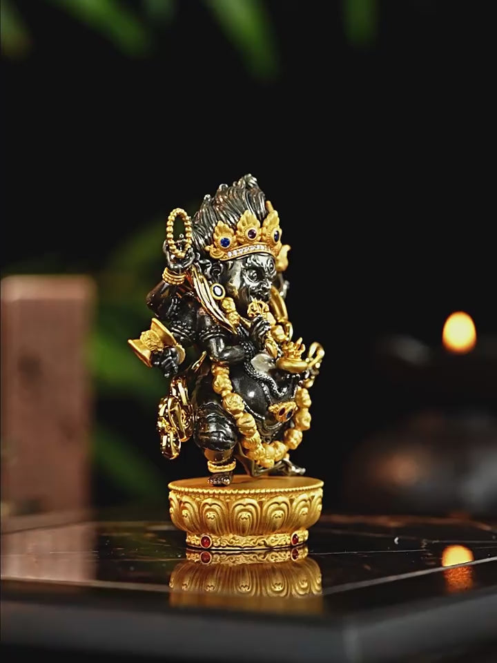 六臂大黑天象征 “破障、纳福、掌力” —— 忿怒相破除生命无明障碍,六臂法器暗合 “事事顺遂” 的祈愿。摆件以鎏金嵌宝工艺,还原其黑金法相:黑色喻降伏烦恼,金色显护法尊贵,宝石点缀更衬神圣,让藏传护法的威严祝福,成为可触的信仰载体与艺术藏品。