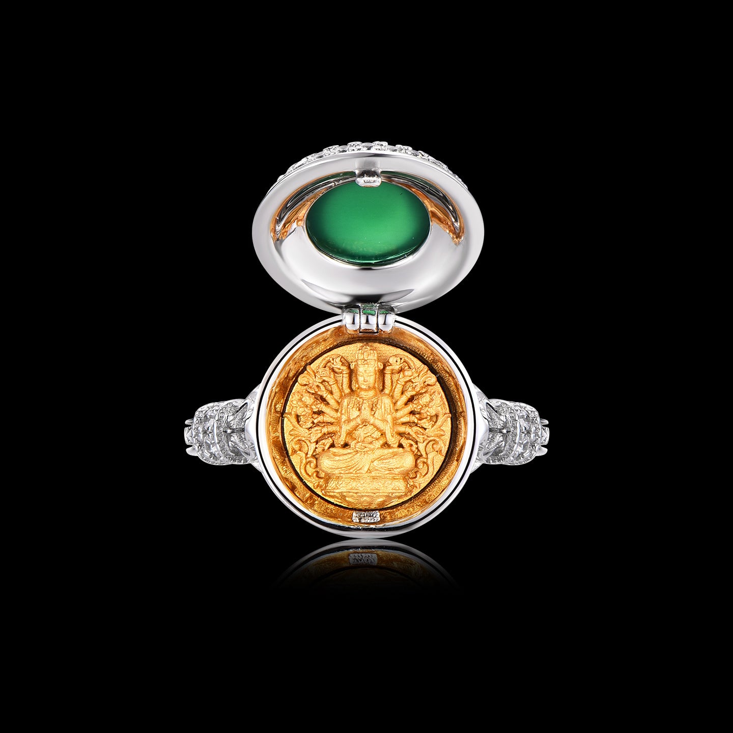 以圓潤綠玉髓為主石,周邊鑲嵌閃亮飾石,凸顯綠玉髓的翠色與質感;採用可開合設計,內藏千手觀音像,既讓生肖鼠的佩戴者能時刻與觀音願力相連,又使戒指外觀精緻時尚,滿足裝飾與精神寄託的雙重需求,從造型到結構,皆為傳遞那份來自千手觀音與綠玉髓的平安美好護佑(針對生肖鼠)。