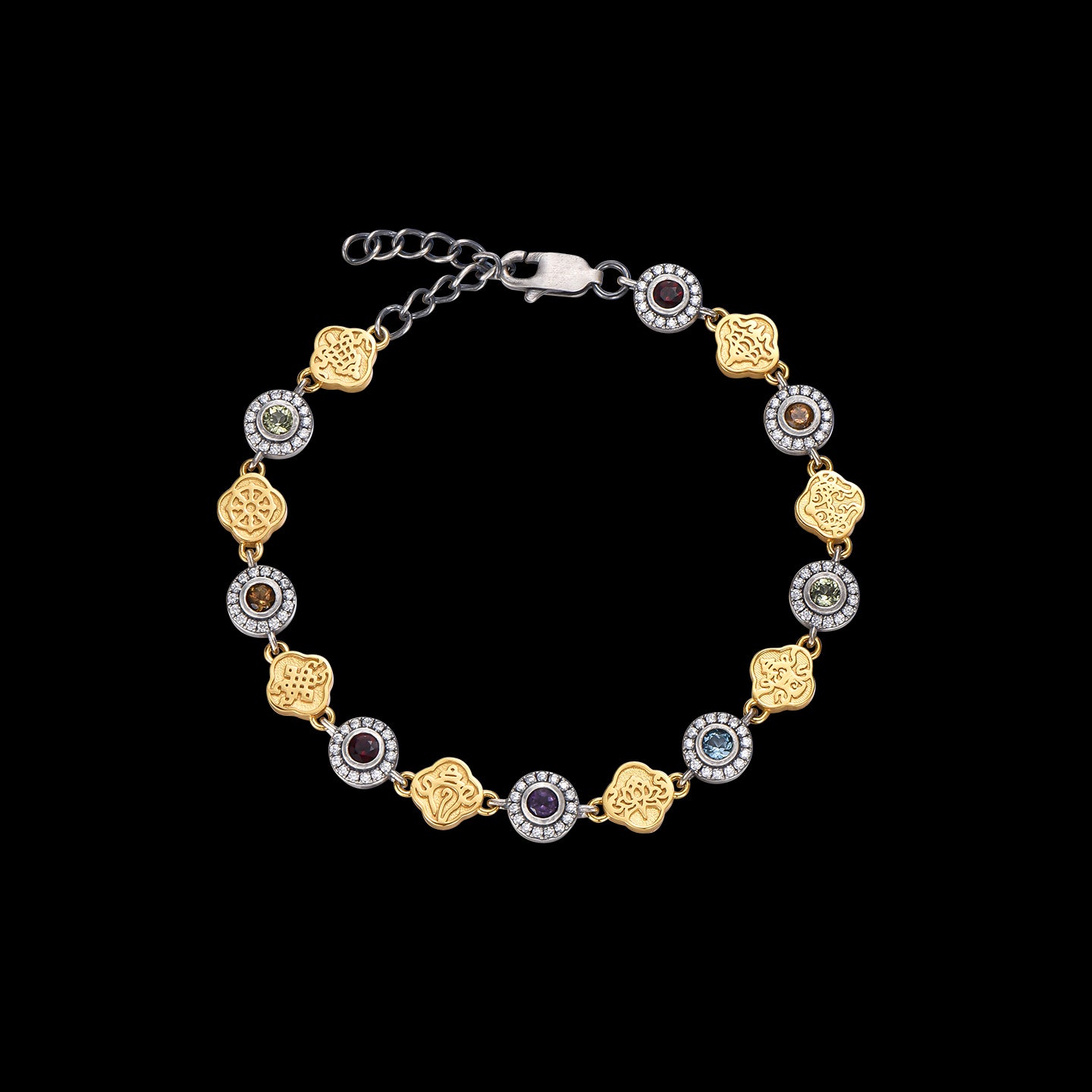 选择吉祥八宝,因它在藏传佛教文化里,是 “全方位祝福的集合体”—— 法轮寓意大法圆转,法螺象征声名远扬,宝伞代表遮蔽魔障,白盖寓意广施慈悲,莲花象征纯净无染,宝瓶代表福智圆满,金鱼寓意活泼自在,盘长结象征连绵不断 。手链以银镀金花丝工艺呈现八宝元素,搭配合成方氧化锆,既还原八宝的独特造型与文化寓意,又借时尚手链设计,适配现代审美与日常佩戴需求。把吉祥八宝的护佑祝福与手链结合,让 “八宝护佑,吉祥随行” 从宗教祈愿,变为可随身相伴、兼具文化底蕴与美观的 “幸运手链”,满足人们对多元祝福与饰品美观的需求,传递文化温度与正向能量