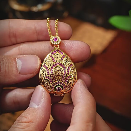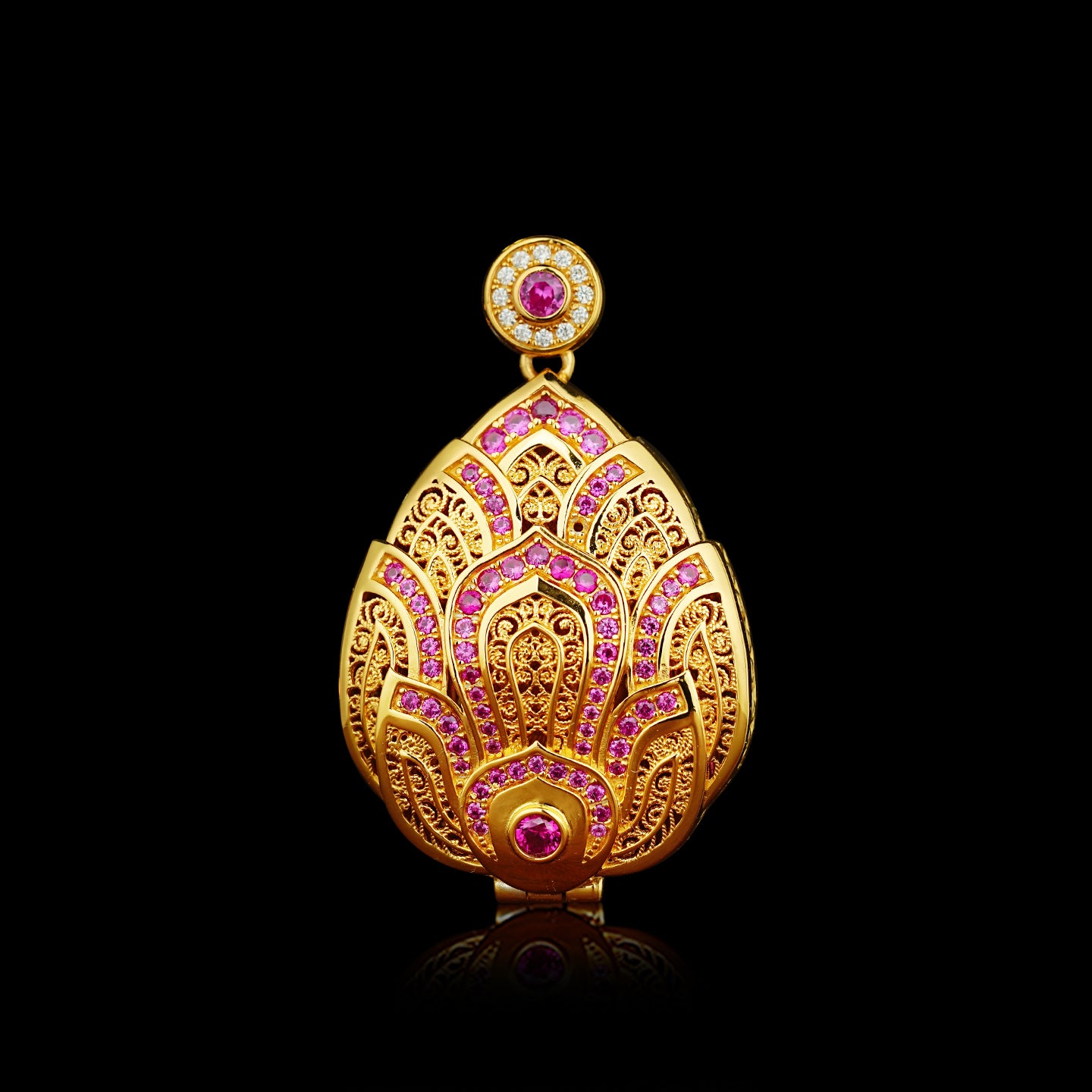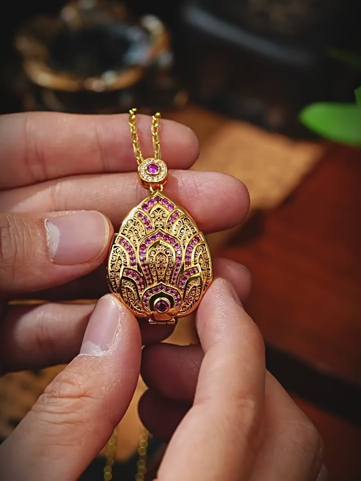 藏傳佛文化裡,嘎烏盒是信仰與祝福的載體,地藏王菩薩「大願救度」精神,深植於信眾心間。此吊墜將二者融合,金質象徵恆久、寶石寓意純淨,既承襲佛文化中「護佑、圓願」之義,又以現代設計語言,讓古老信仰符碼煥新。它是連接藏傳佛文化與當代生活的橋梁,使佩戴者在佩帶間,親近傳統信仰智慧,讓千年文化脈動,持續滋養當代心靈,續寫信仰傳承的當代篇章 。