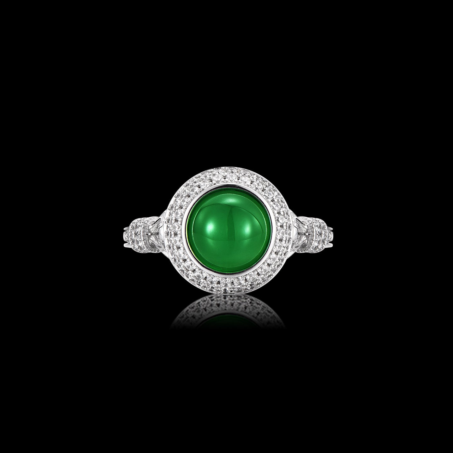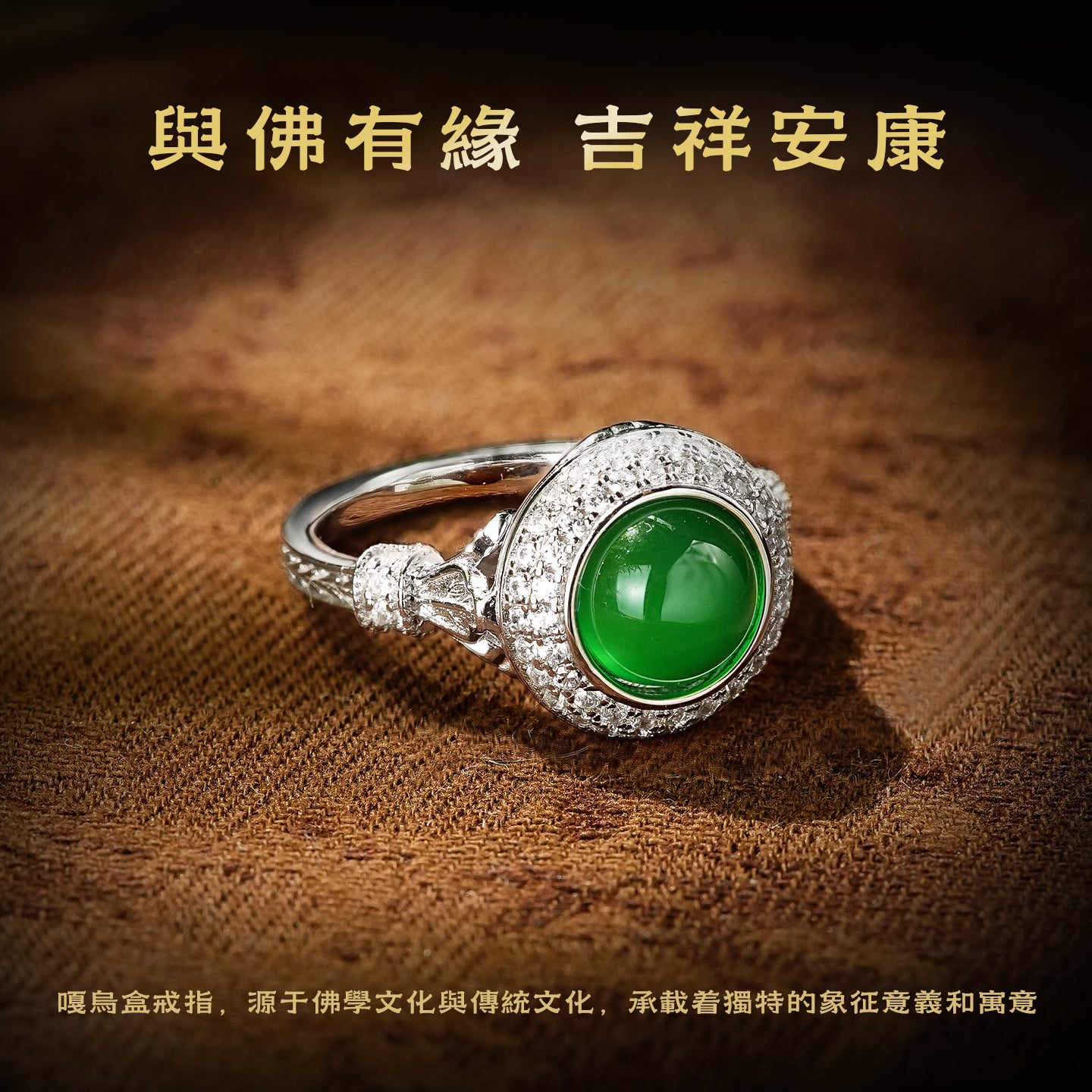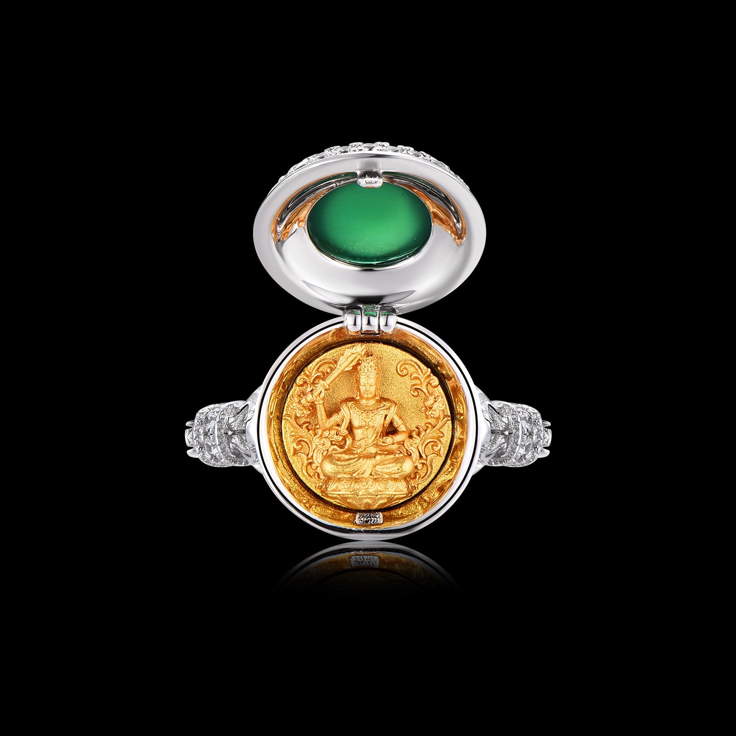 以圓潤綠玉髓為主石,周邊鑲嵌閃亮飾石,凸顯綠玉髓的翠色與靈動質感;採用可開合設計,內藏文殊菩薩像,既讓生肖兔的佩戴者能時刻與菩薩智慧願力相連,又使戒指外觀精緻時尚,滿足裝飾與精神寄託的雙重需求,從造型到結構,皆為傳遞那份來自文殊菩薩與綠玉髓的學業順利、智慧增長護佑(針對生肖兔)。