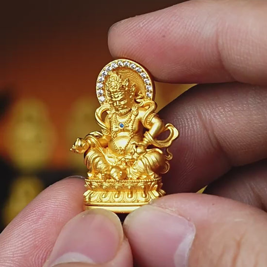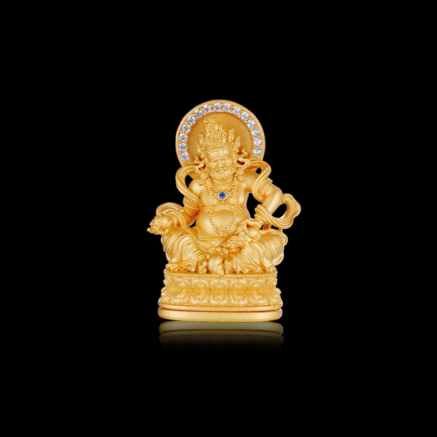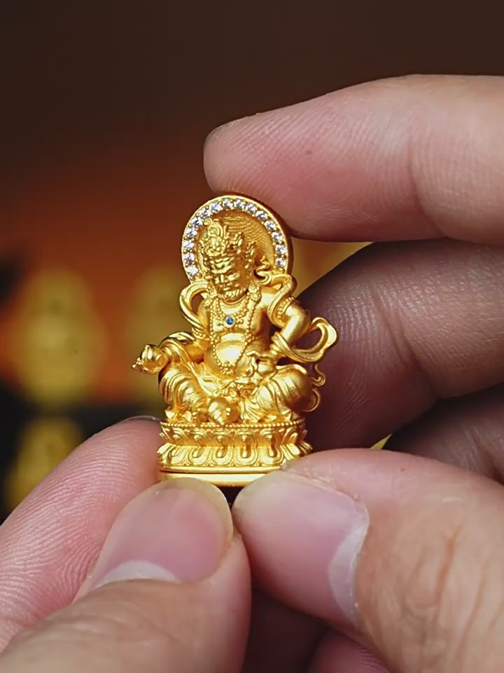 本款黃財神像設計秉持 「威儀莊嚴、富足璀璨」 的理念。聖尊以 S925純銀為胎體,通體施以黃金鍍層,完美呈現黃財神標誌性的金黃法相。精工鑄造其經典形象:身軀豐滿有力,膚色璀璨金黃,頭戴精緻寶冠,面容威猛中蘊含慈悲。右手高擎「布拉噶」如意寶(摩尼寶珠),璀璨奪目,象徵賜予所求財富與世出世間圓滿;左手穩握「吐寶鼠」(吐寶鼬),鼠口微張,寓意財源滾滾、珍寶不竭。右足輕踏象徵財富根基的海螺寶瓶,左足蜷曲,呈自在坐姿於蓮花日月輪寶座之上。 周身瓔珞寶石刻畫細膩。佛像 背面設計簡潔無紋,更顯莊重純粹,便於隨身貼佩。整體造型威儀富足,璀璨尊貴,時刻提醒:財富需以正念獲取,更需以智慧善用、慷慨布施方能長久豐盈。