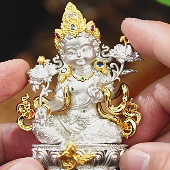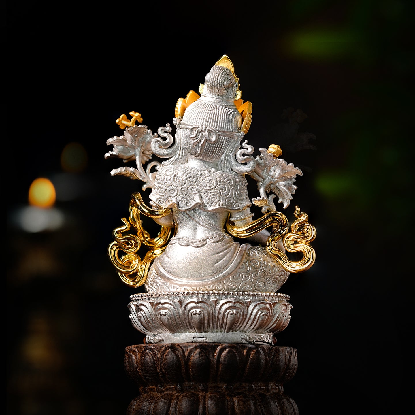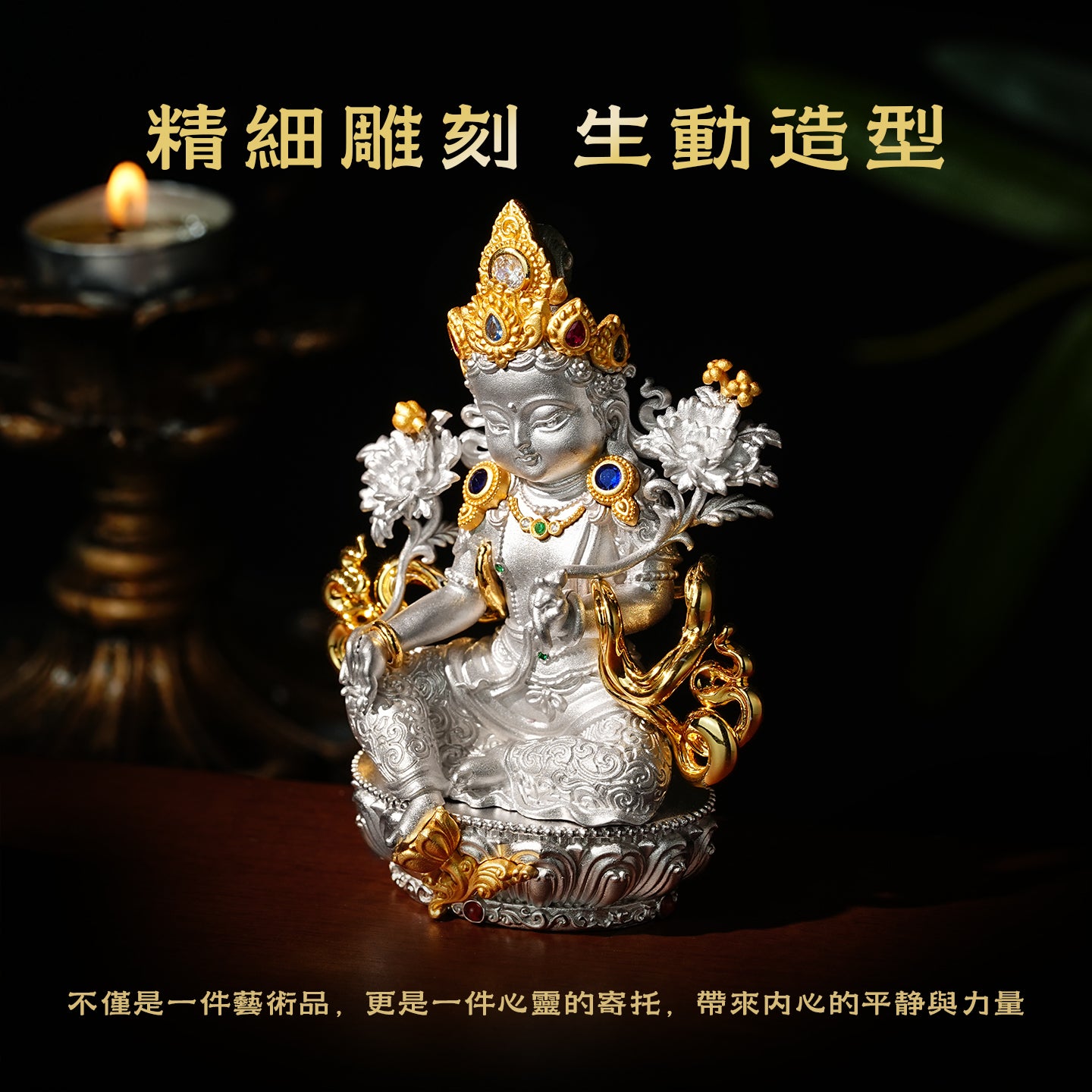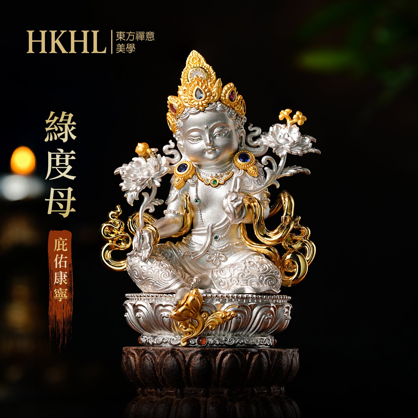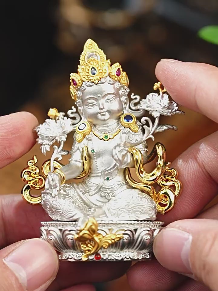 绿度母是藏传信仰里 “慈悲与救渡” 的具象,承载 “消灾解难、护佑康宁” 的祈愿 。摆件以鎏金工艺赋予铜像华贵质感,宝石镶嵌呼应传统造像的庄严法度,既是宗教文化的载体,更是凝聚匠心的艺术藏品 —— 让信仰温度与美学价值共生。