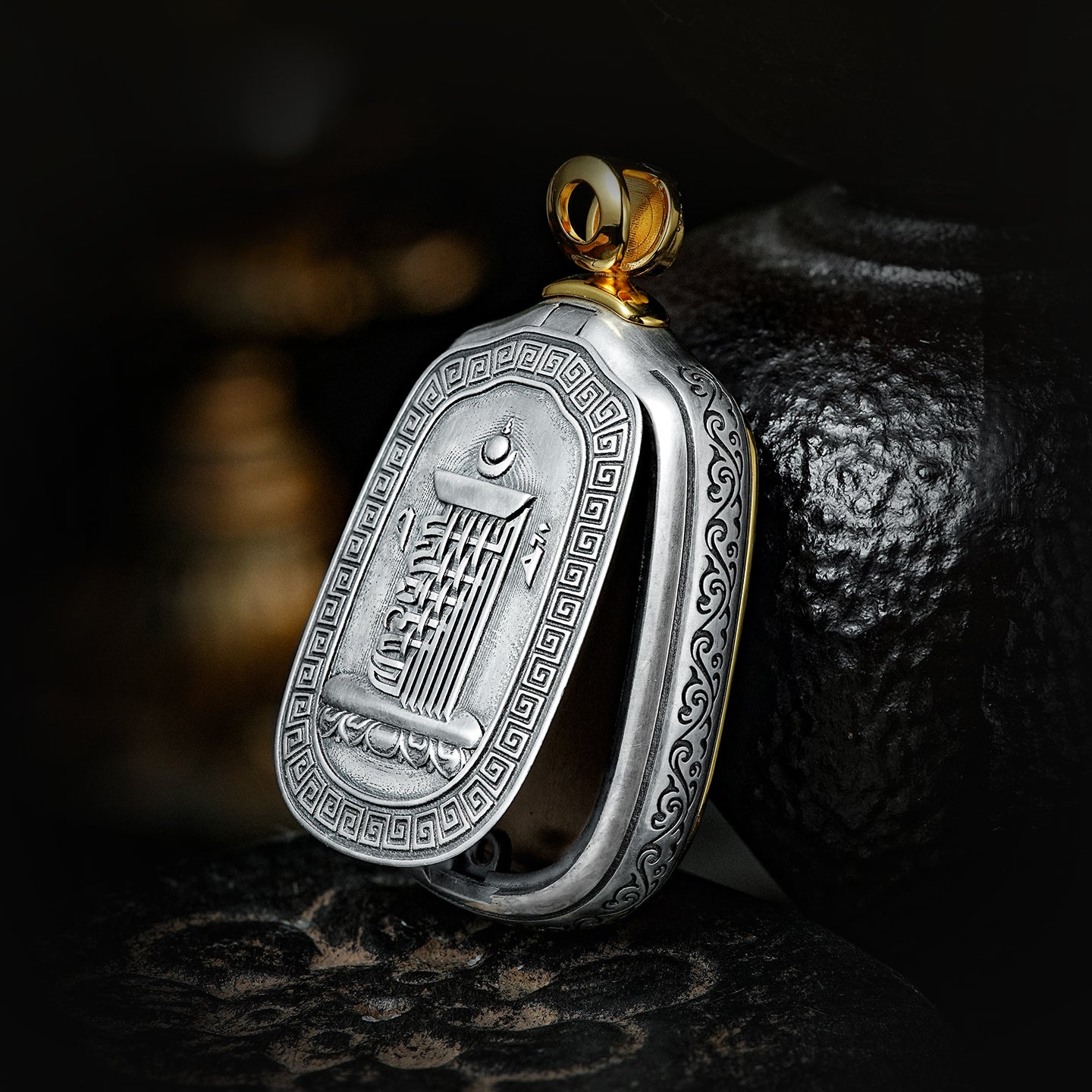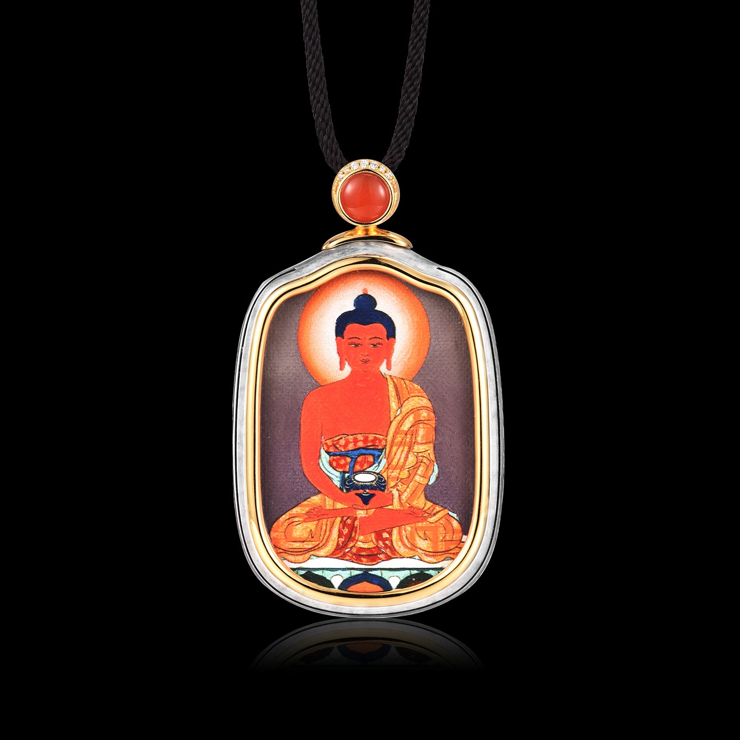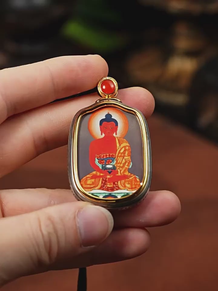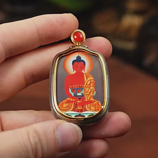 阿彌陀佛(Amitabha),意爲"無量光"、"無量壽",爲西方極樂世界教主。在藏傳佛教中,其淨土信仰深植人心,唐卡作爲移動的壇城,更是將佛國淨土濃縮於方寸之間的修行聖物。此吊墜將千年唐卡繪製儀軌與金工技藝相融,讓佛法智慧可隨身佩戴,時刻觀想。