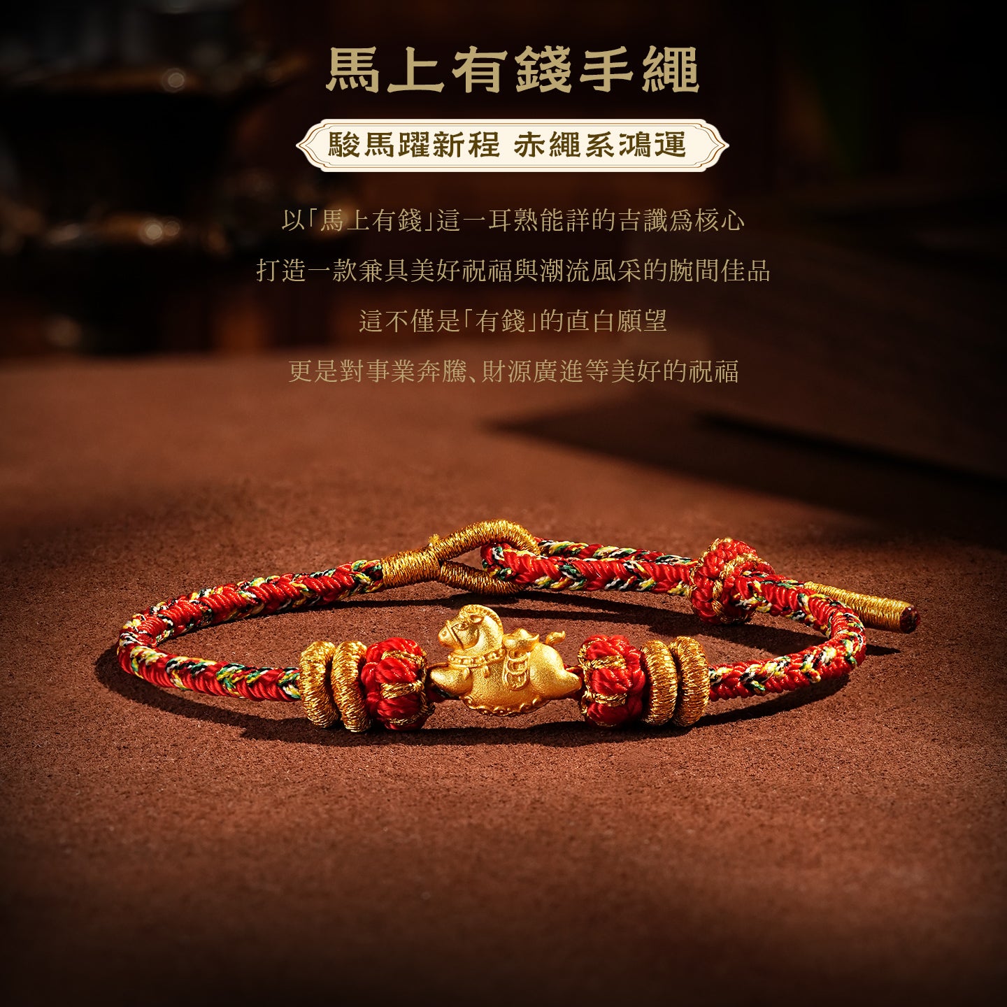 紅繩向來是本命年的祈福象徵,代表驅邪納福;「馬上有錢」是民間諧音吉讖,承載財運願望。這款手繩將生肖文化、紅繩民俗與吉讖寓意相融合,以編織紅繩搭配金質駿馬的設計,讓馬年本命年佩戴者在腕間承接八方來財的祝福,是傳統民俗與現代飾品的溫情結合。