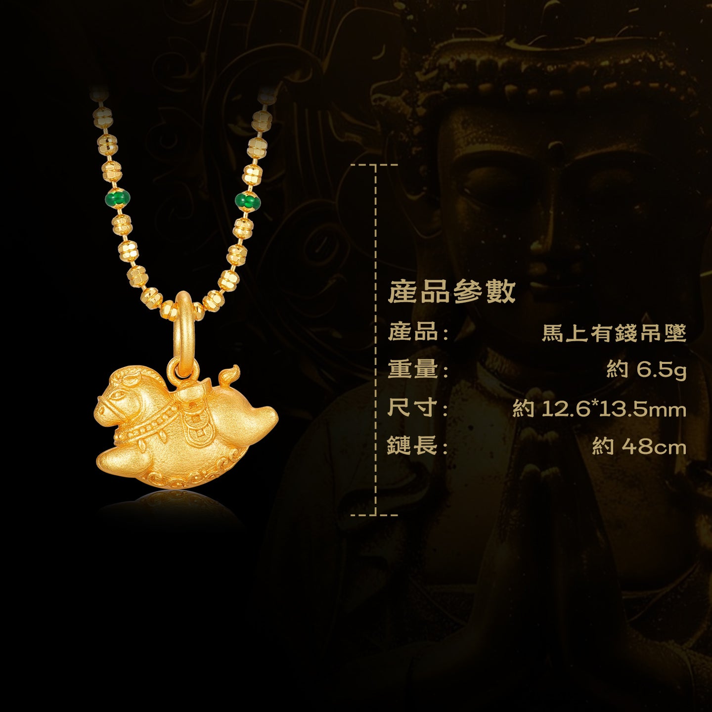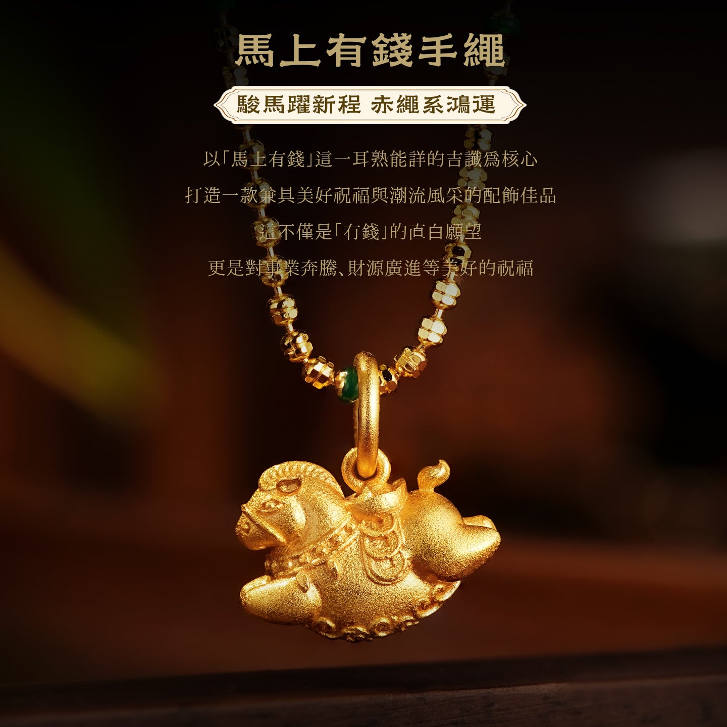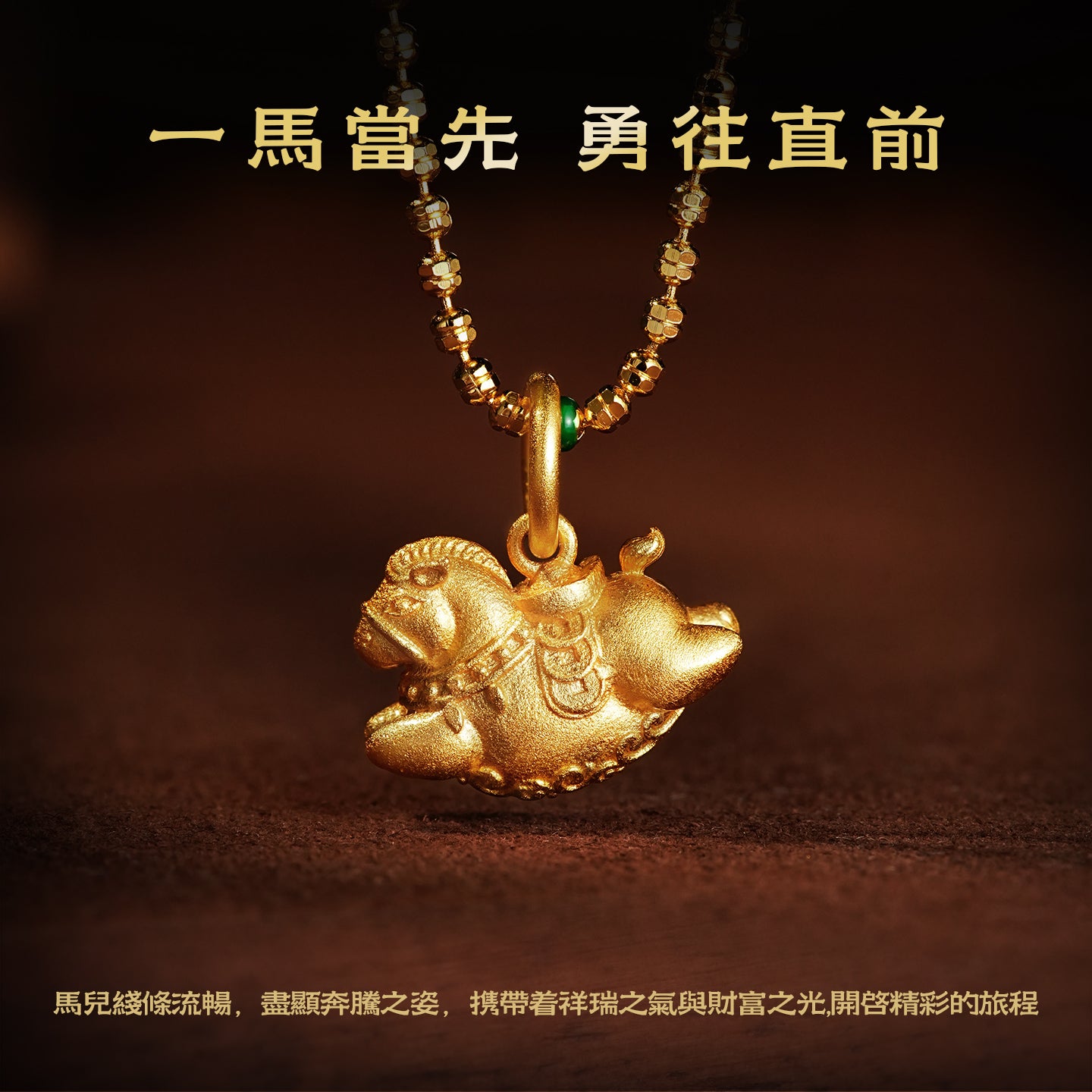 選擇「馬上有錢」打造馬年本命年吊墜,是因「馬」對應馬年本命年,兼具生肖屬性與吉祥寓意,「馬上有錢」的諧音吉讖,既承載著財運亨通的直白願望,也蘊含事業奔騰的美好祝福;吊墜以金質打造駿馬造型,馬身飾有錢幣紋理,搭配細緻鏈條與綠玉髓點綴,既保留民俗吉讖的親和感,又通過精緻工藝提升飾品質感,使其成為馬年本命年專屬的祈福飾品,兼具文化寓意與裝飾價值。