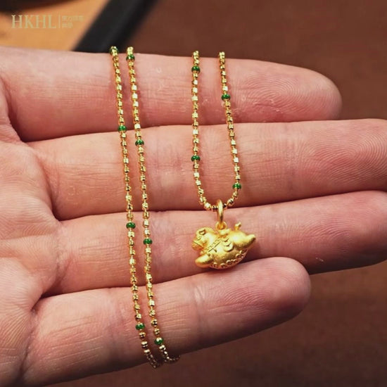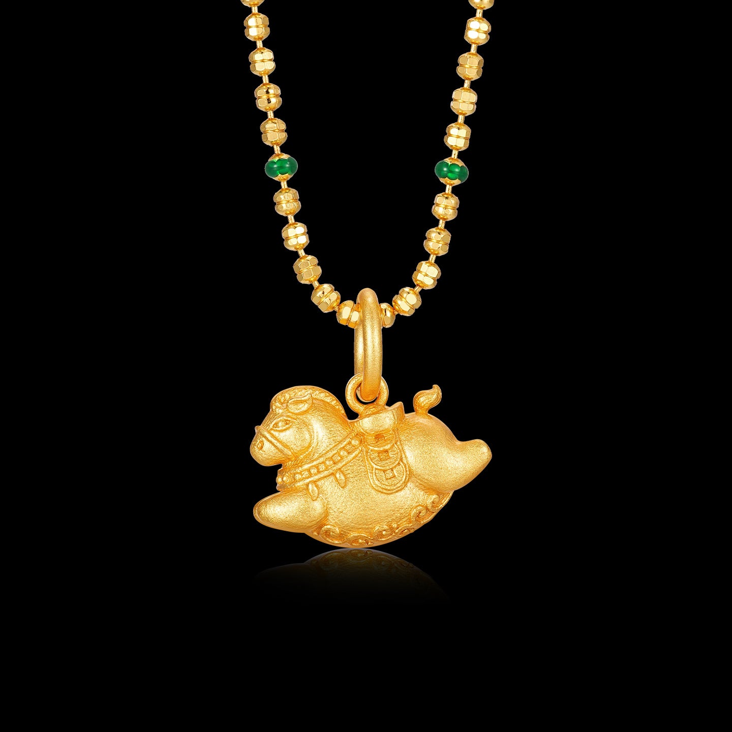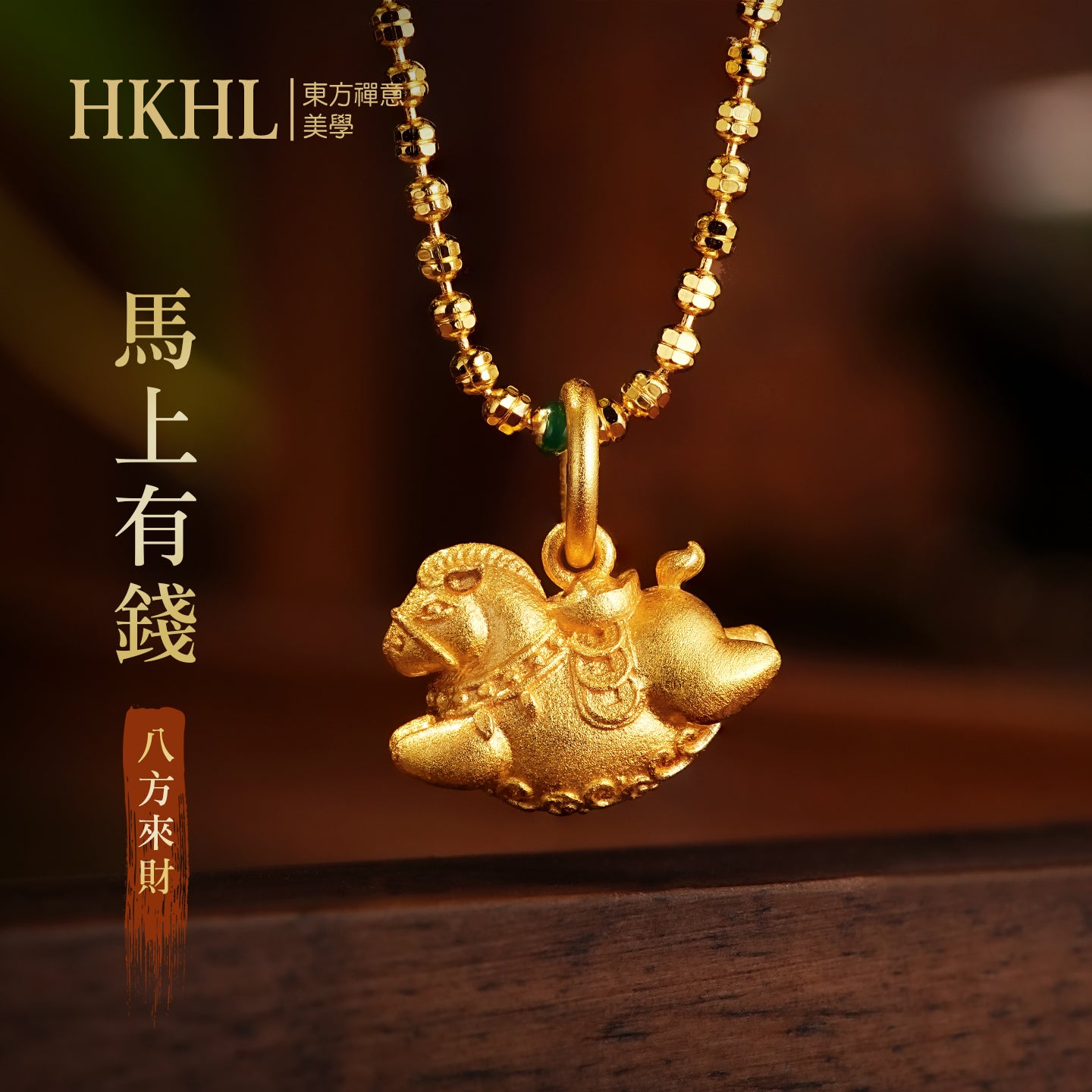 選擇「馬上有錢」打造馬年本命年吊墜,是因「馬」對應馬年本命年,兼具生肖屬性與吉祥寓意,「馬上有錢」的諧音吉讖,既承載著財運亨通的直白願望,也蘊含事業奔騰的美好祝福;吊墜以金質打造駿馬造型,馬身飾有錢幣紋理,搭配細緻鏈條與綠玉髓點綴,既保留民俗吉讖的親和感,又通過精緻工藝提升飾品質感,使其成為馬年本命年專屬的祈福飾品,兼具文化寓意與裝飾價值。