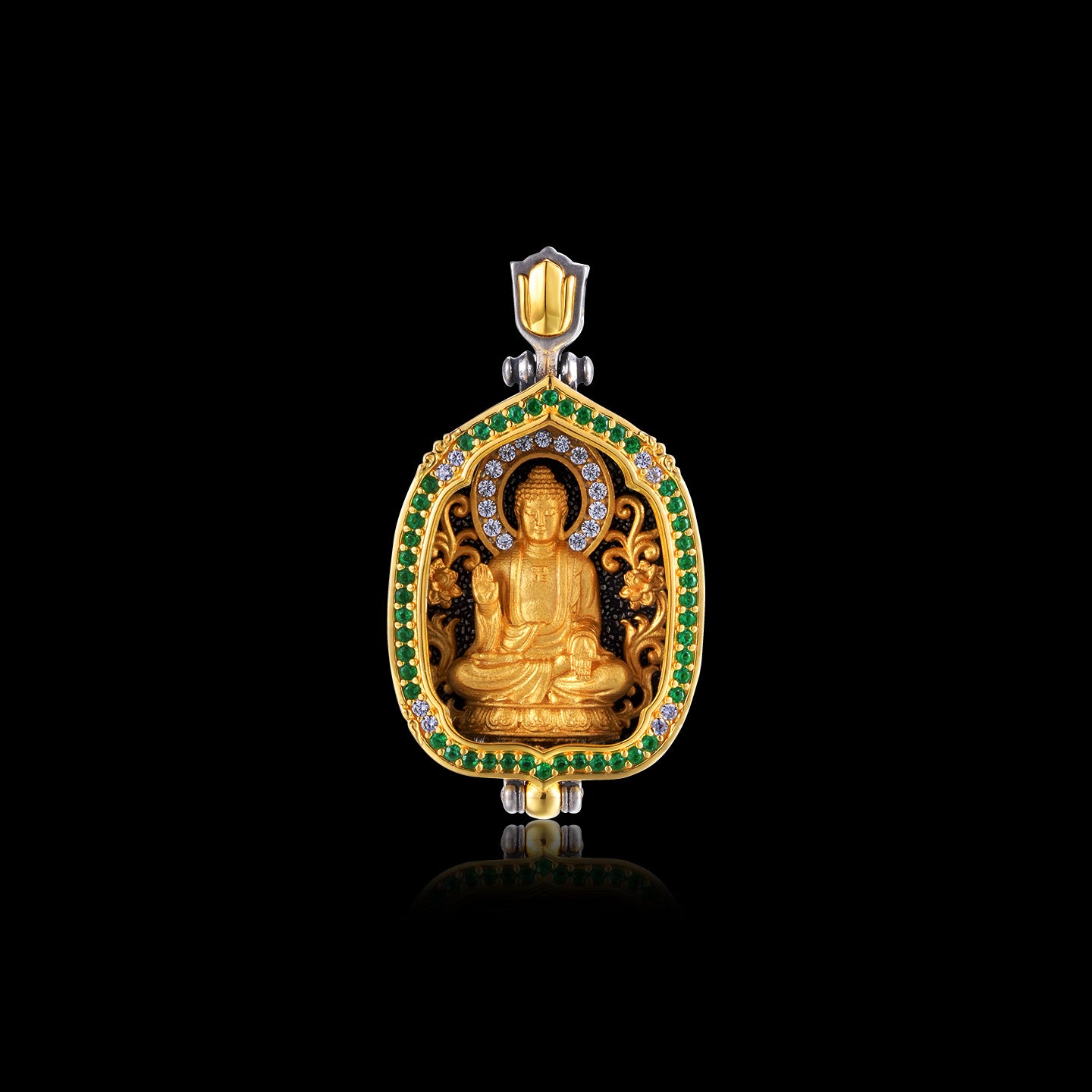 พระพุทธรูปทรงรัศมีเศียรมีลวดลายเมฆมงคลที่กลวงเป็นโพรง สื่อถึงแสงสว่างที่ส่องทะลุอุปสรรคทางโลก ฐานดอกบัวสลักสัญลักษณ์สวัสดิกะหมุนวน สื่อถึงการไหลเวียนของพลังงานจักรวาล ด้านหลังสลักข้อความมงคล “ความมั่งคั่งและความสุขมารวมกัน” และขอบด้านข้างฝังทองคำสองชั้น สื่อถึง “พรและพรทวีคูณ” ภาพรวมดูเคร่งขรึมแต่กลมกลืน สื่อถึงการอยู่ร่วมกันอย่างกลมกลืนระหว่างความเมตตากรุณาของพระสัมมาสัมพุทธเจ้าและความอุดมสมบูรณ์ของโลกนี้