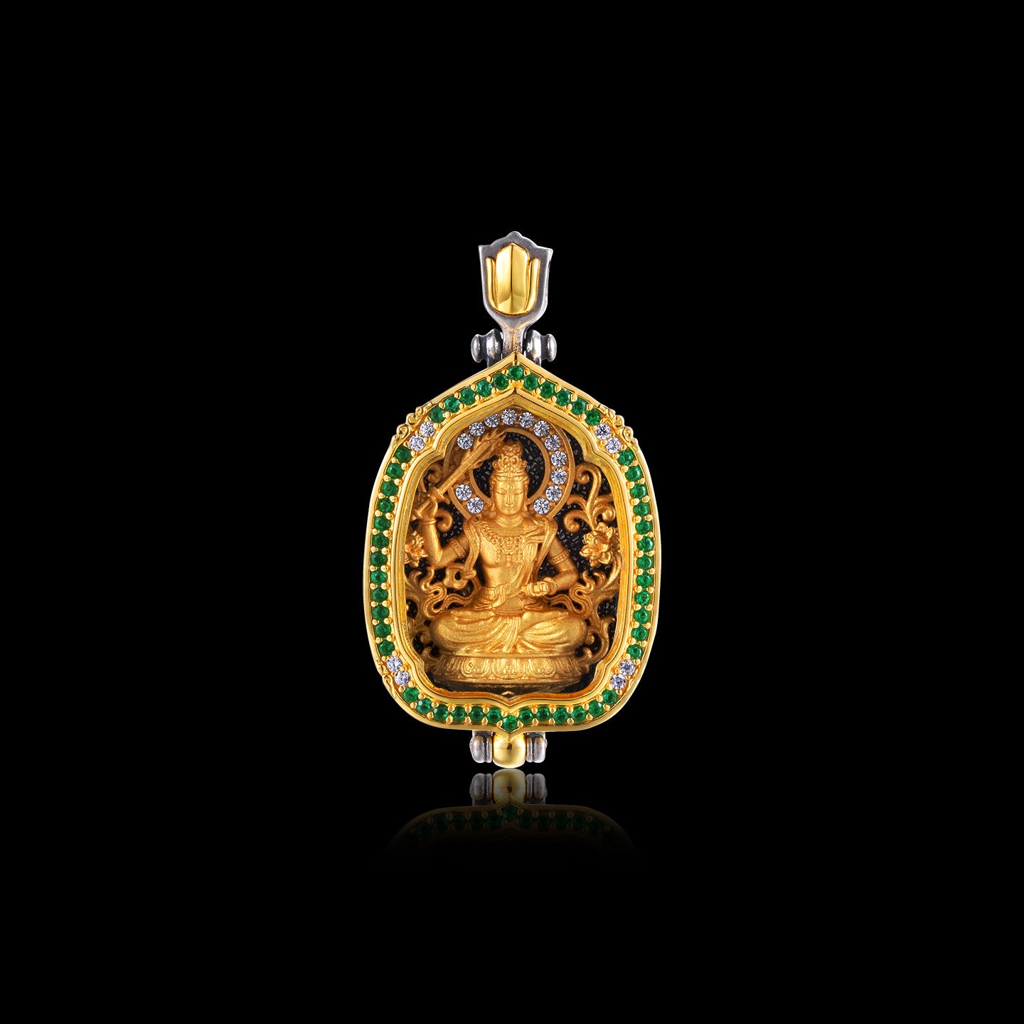 1. แกนของจี้ใช้รูปแบบนูนสูงแบบเรียบง่ายเพื่อเน้นไปที่ช่วงเวลาที่พระโพธิสัตว์มัญชุศรีถือดาบแห่งปัญญา (เพื่อตัดความคิดที่ฟุ้งซ่าน) และถือพระสูตร/ดอกบัว (เพื่อปลุกปัญญาที่แท้จริง)