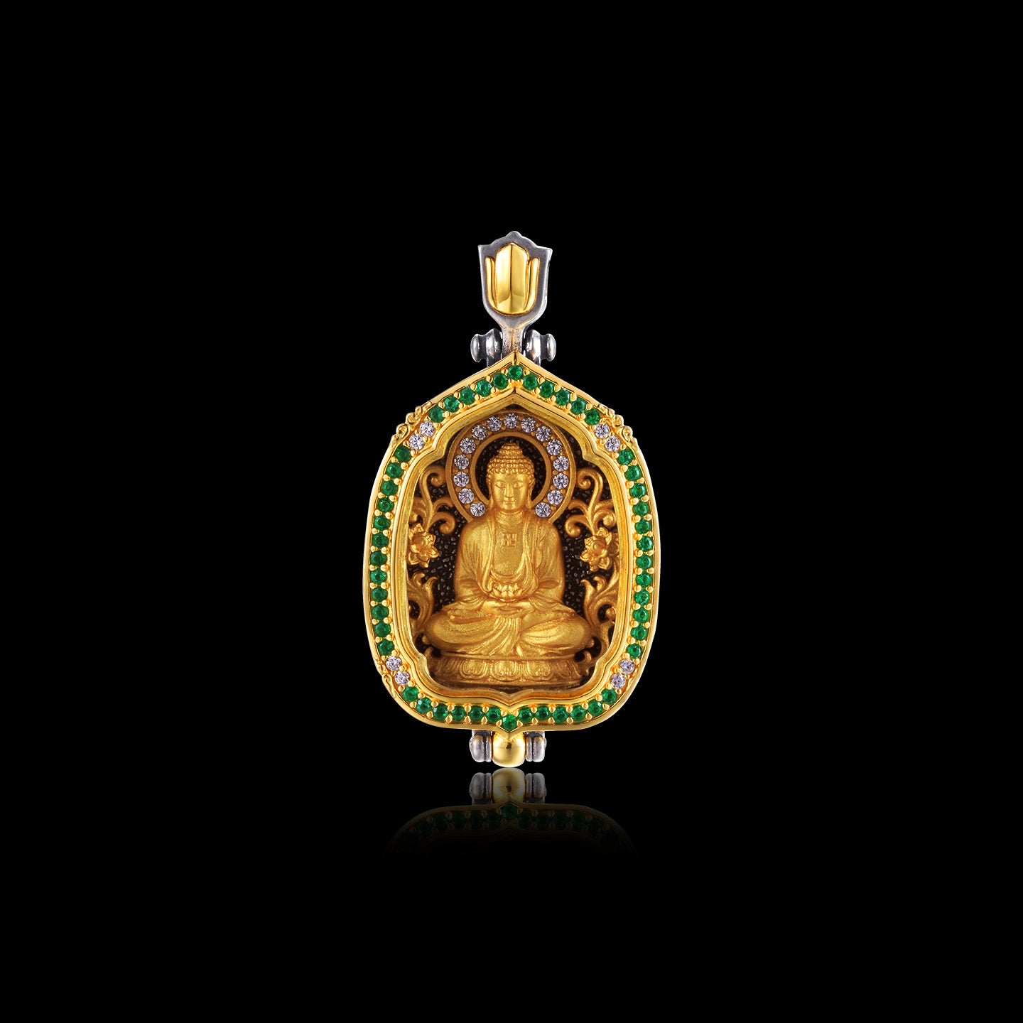 พระพุทธรูปอมิตาภองค์นี้ได้รับการออกแบบโดยยึดหลักความเคร่งขรึม ความบริสุทธิ์ ความเรียบง่าย และความอมตะ พระพุทธรูปนี้แสดงภาพพระอมิตาภพุทธเจ้าใน "มุทราชี้แนะ" อันเป็นสัญลักษณ์อันศักดิ์สิทธิ์ (พระหัตถ์ขวาชูขึ้นในอภิธรรมสัมโพธิมุทรา พระหัตถ์ซ้ายวางลงในคานธีสัมโพธิมุทรา) ซึ่งเป็นสัญลักษณ์ของการขจัดความทุกข์ทรมานและการประทานความสงบสุข พระพุทธรูปมีพระอิริยาบถที่สง่างามและสงบ พระพักตร์ยิ้มแย้มเปี่ยมด้วยความเมตตา พระมงกุฎทรงอยู่บนยอดพระกรรณอันสมบูรณ์แบบ ทรงฉลองพระองค์แบบเรียบง่าย เส้นสายที่พลิ้วไหวสะท้อนถึงแสงสว่างและพระชนม์ชีพอันหาประมาณมิได้ของพระพุทธเจ้า พระผู้ทรงเป็นคุณธรรมในการชี้นำสรรพสัตว์ ขณะเดียวกันก็โอบรับสุนทรียศาสตร์สมัยใหม่ ทำให้เหมาะสำหรับสวมใส่ในชีวิตประจำวัน เตือนใจผู้สวมใส่ให้รักษาจิตใจให้บริสุทธิ์ ปลูกฝังความคิดที่ดี และศรัทธาต่ออนาคตที่สดใส