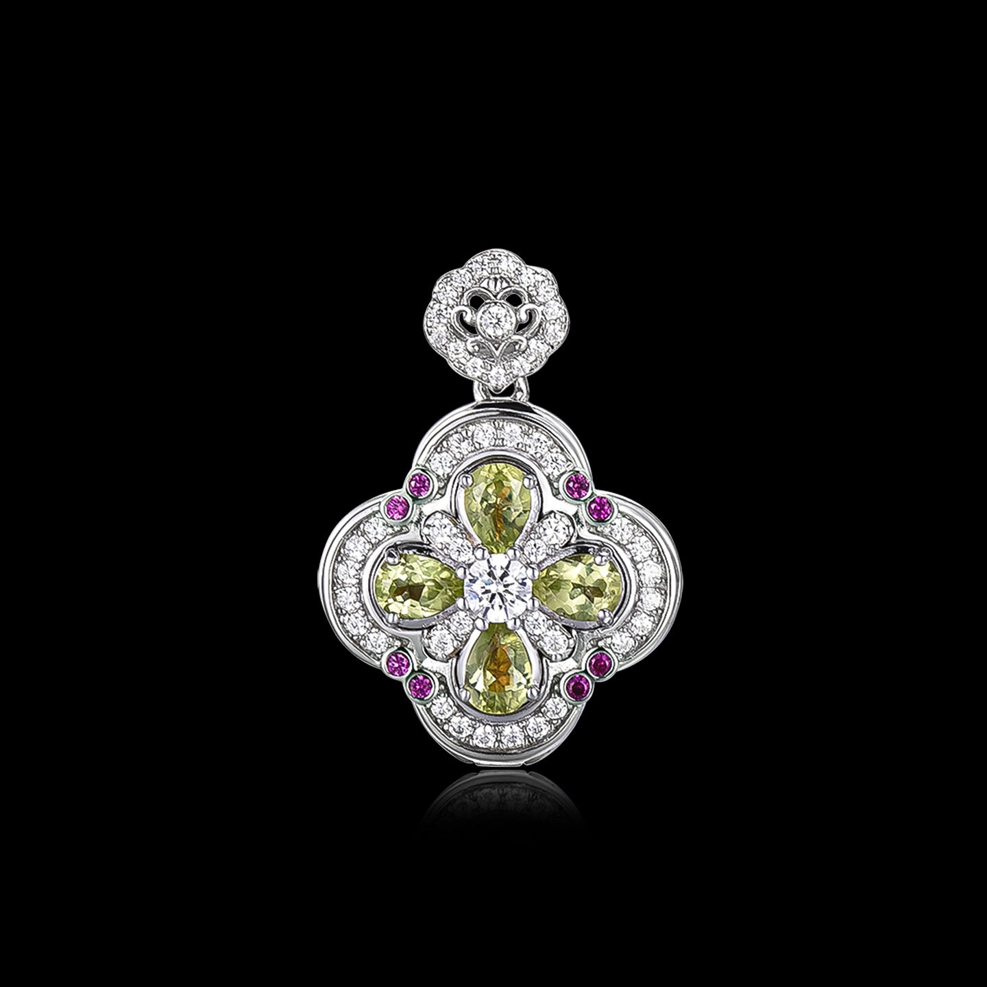 จี้ชิ้นนี้คือการผสมผสานอย่างสร้างสรรค์ระหว่างวัฒนธรรมความมั่งคั่งของชาวพุทธทิเบตและสัญลักษณ์สากลแห่งโชคลาภ จัมบาลาสีเหลือง หัวหน้าเทพแห่งความมั่งคั่งทั้งห้า ฝังรากลึกในตันตระ ปฏิญาณที่จะประทานความมั่งคั่งอุดมสมบูรณ์และความสำเร็จในหน้าที่การงานให้แก่ผู้ที่มีความซื่อสัตย์สุจริต กล่องกาวู (Gawu) สืบทอดประเพณีอันเคร่งขรึมของ "ศาลเจ้าพุทธเคลื่อนที่" ใบโคลเวอร์สี่แฉกเป็นสัญลักษณ์ของโชคลาภและความมีชีวิตชีวาในวัฒนธรรมต่างๆ การผสมผสานองค์ประกอบทั้งสามนี้ไม่เพียงแต่สะท้อนถึงปณิธานทางพุทธศาสนาที่ว่า "พรของพระพุทธเจ้า สำเร็จทุกประการ" เท่านั้น แต่ยังทำให้กาวูดั้งเดิมมีความหมายใหม่เกี่ยวกับความมั่งคั่งผ่านใบโคลเวอร์สี่แฉก ซึ่งสะท้อนถึงความครอบคลุมและนวัตกรรมของมรดกทางวัฒนธรรม พรอันล้นเหลือของเทพเจ้าแห่งความมั่งคั่ง ซึ่งแสดงออกในฐานะสัญลักษณ์อันเปี่ยมพลังและเป็นมงคล จะสถิตอยู่กับผู้สวมใส่เสมอ นำพาความมั่งคั่งทางโลกและความปรารถนาดีมาให้