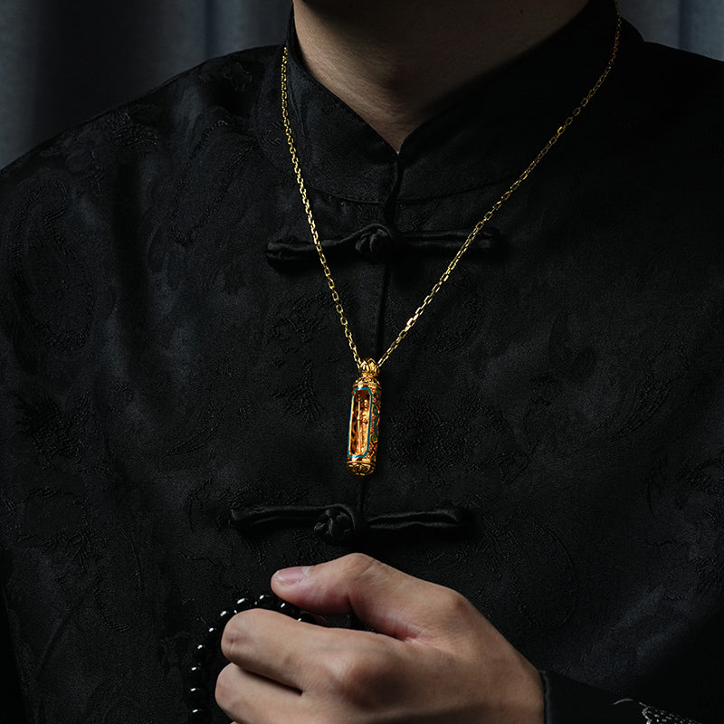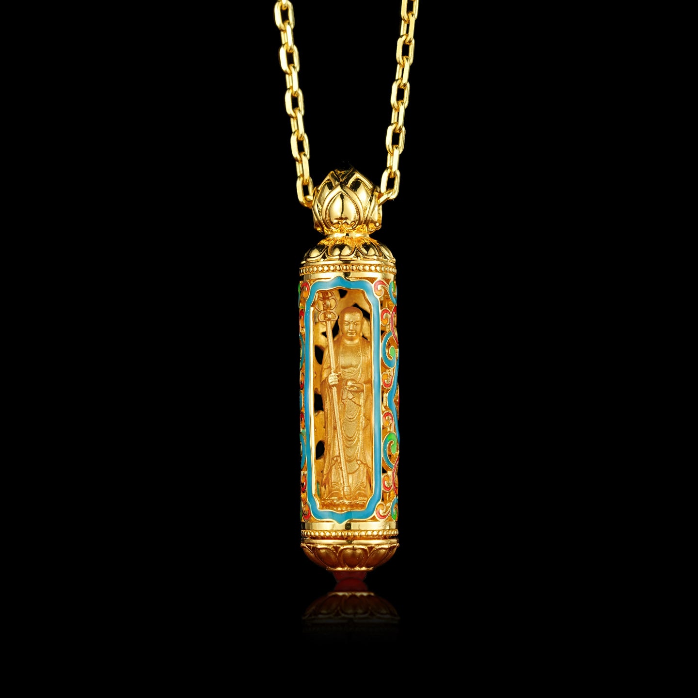 ในวัฒนธรรมพุทธ “คำปฏิญาณอันยิ่งใหญ่แห่งความหลุดพ้น” ของพระกษิติครรภโพธิสัตว์ คือแก่นแท้แห่งการปกป้องคุ้มครองทางจิตวิญญาณสำหรับผู้ศรัทธา เคลือบฟัน ซึ่งเป็นงานฝีมือดั้งเดิม สื่อถึงความงามและความสูงส่ง ขณะที่เงินสเตอร์ลิงสื่อถึงความบริสุทธิ์และความคงทนถาวร เมื่อผสานเข้ากับถังพระพุทธรูปหมุนได้ องค์ประกอบทั้งสองนี้ไม่เพียงแต่สืบทอดอุดมคติทางพุทธศาสนาเกี่ยวกับความเมตตาและการปกป้องคุ้มครองเท่านั้น แต่ยังสืบสานประเพณี “การใช้ภาชนะเพื่อถ่ายทอดคำปฏิญาณ” อีกด้วย จี้นี้ช่วยให้จิตวิญญาณแห่งคำปฏิญาณอันยิ่งใหญ่ที่สืบทอดกันมานับพันปี ก้าวข้ามกาลเวลา ผสานเข้ากับชีวิตยุคปัจจุบันอย่างมีสไตล์และสง่างาม จี้นี้เปรียบเสมือนสะพานเชื่อมศรัทธาโบราณเข้ากับจิตใจสมัยใหม่ ช่วยให้ผู้สวมใส่สามารถเชื่อมโยงและถ่ายทอดวัฒนธรรมอันลึกซึ้งแห่งการหลุดพ้นและการปกป้องคุ้มครองนี้ผ่านการหมุนเวียน