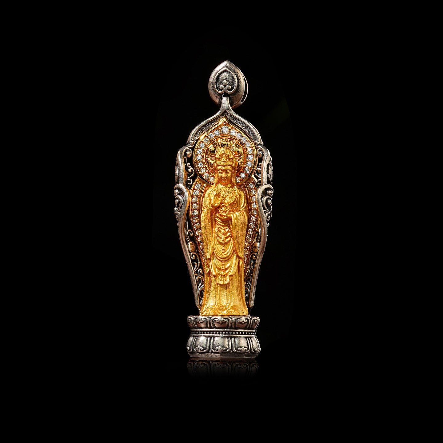 งานฝีมือเงินแท้: หล่อจากเงินสเตอร์ลิงบริสุทธิ์สูง อัญมณีชิ้นนี้สะท้อนถึงธรรมกายอันบริสุทธิ์และพระปัญญาอันรุ่งโรจน์ของพระโพธิสัตว์ งานฝีมืออันประณีตบรรจงทำให้เส้นสายที่เรียบลื่นไหล (เสื้อผ้าและสร้อยคอ) โดดเด่นด้วยรายละเอียดที่สดใส (ใบหน้า วัตถุที่ถือ) และผิวเคลือบมันเงาสูง สร้างสรรค์เป็นสมบัติอันศักดิ์สิทธิ์และสง่างามที่เปี่ยมไปด้วยการปกป้องคุ้มครองอันบริสุทธิ์