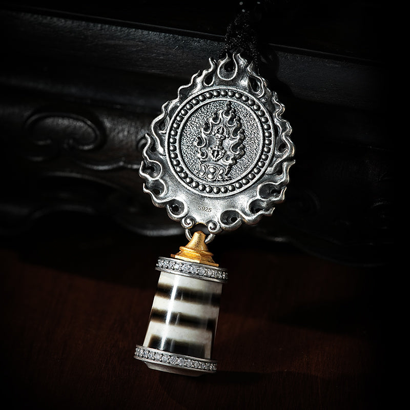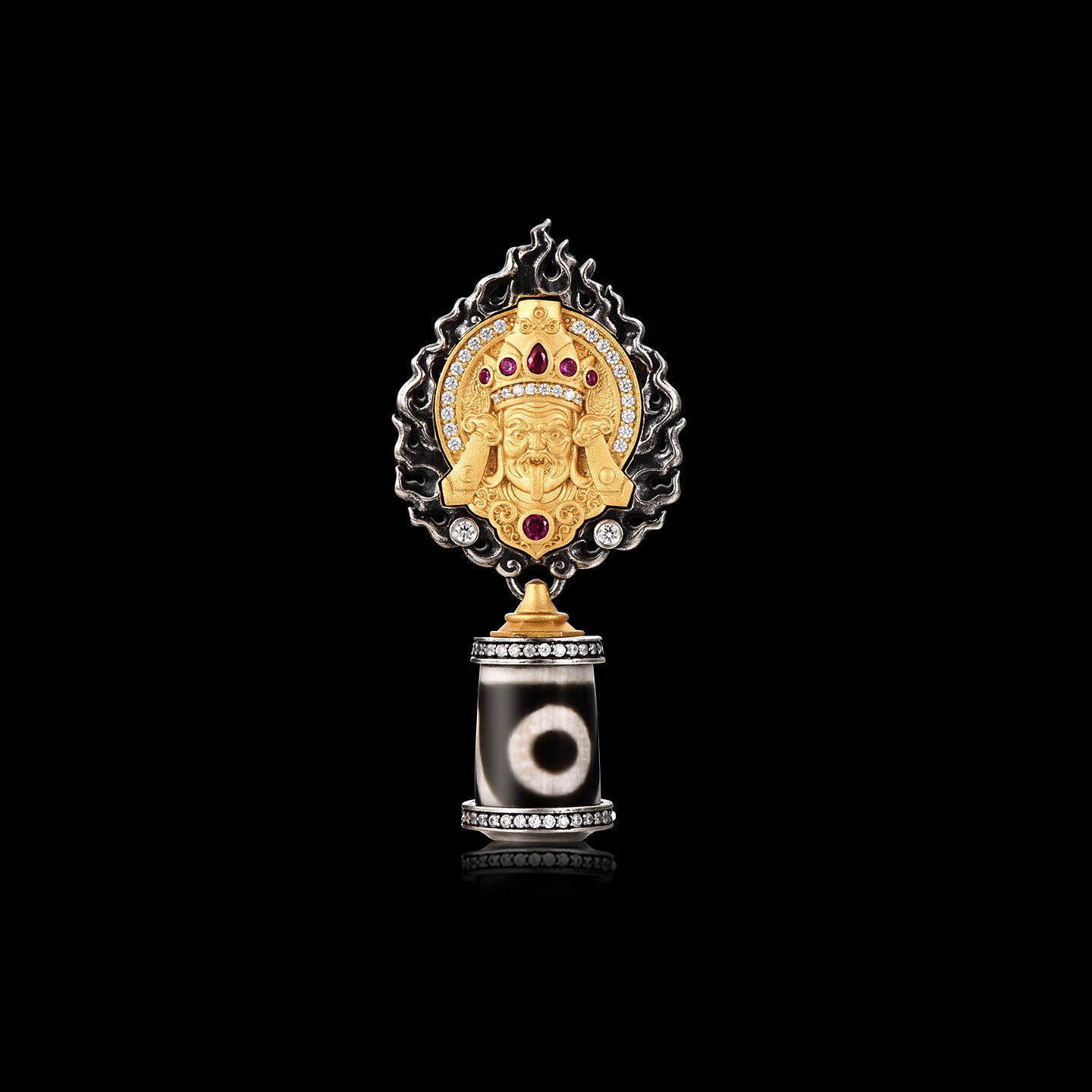 จาจิราม เทพผู้พิทักษ์สตรีองค์พิเศษในศาสนาพุทธแบบทิเบต หรือที่รู้จักกันในนามเทพีแห่งโชคลาภ เป็นที่เคารพนับถืออย่างสูงในทิเบต ตำนานเล่าขานว่าพระองค์คุ้มครองผู้ศรัทธา นำพาความมั่งคั่งและความสำเร็จในหน้าที่การงาน และเป็นตัวแทนของความปรารถนาให้ผู้คนมั่งคั่งและโชคดี จี้องค์นี้สะท้อนถึงแก่นแท้ของจาจิราม ผสมผสานกับลูกปัดหินดีซี สัญลักษณ์ดั้งเดิมของทิเบต ถ่ายทอดเรื่องราวการปกป้องคุ้มครองอันเลื่องชื่อผ่านงานฝีมือสมัยใหม่ ถ่ายทอดความเชื่อโบราณนี้สู่ชีวิตประจำวัน
