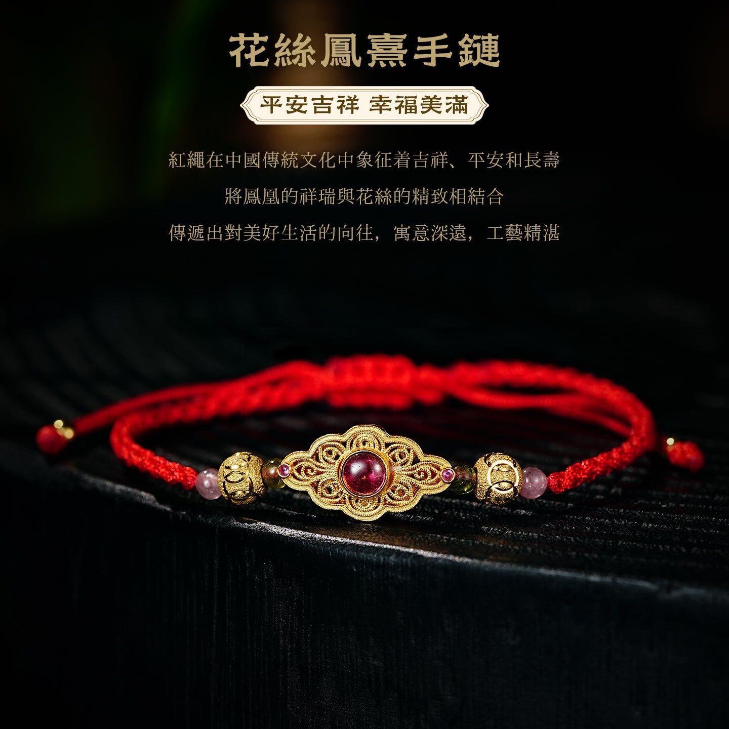 ในวัฒนธรรมจีนโบราณ ด้ายสีแดงเป็นสัญลักษณ์ของพรและปัดเป่าสิ่งชั่วร้ายมายาวนานในช่วงปีนักษัตร นำมาซึ่งความหวังของผู้คนในเรื่องสันติภาพ โชคลาภ และความสุข นกฟีนิกซ์ในฐานะนกมงคล มักเป็นสัญลักษณ์ของความงามและความสูงส่ง สื่อถึงความปรารถนาในชีวิตที่มีความสุข กำไลข้อมือด้ายสีแดงเส้นนี้ผสมผสานวัฒนธรรมด้ายสีแดงแบบดั้งเดิม องค์ประกอบของนกฟีนิกซ์ และงานฝีมือที่ประณีตบรรจง รังสรรค์สัญลักษณ์แห่งพรพื้นบ้านนี้ขึ้นใหม่ผ่านดีไซน์ที่ทันสมัย ​​สานต่อประเพณีการสวดมนต์ขอพรและการแสวงหาความสุขให้คงอยู่ ในรูปแบบเครื่องประดับร่วมสมัย