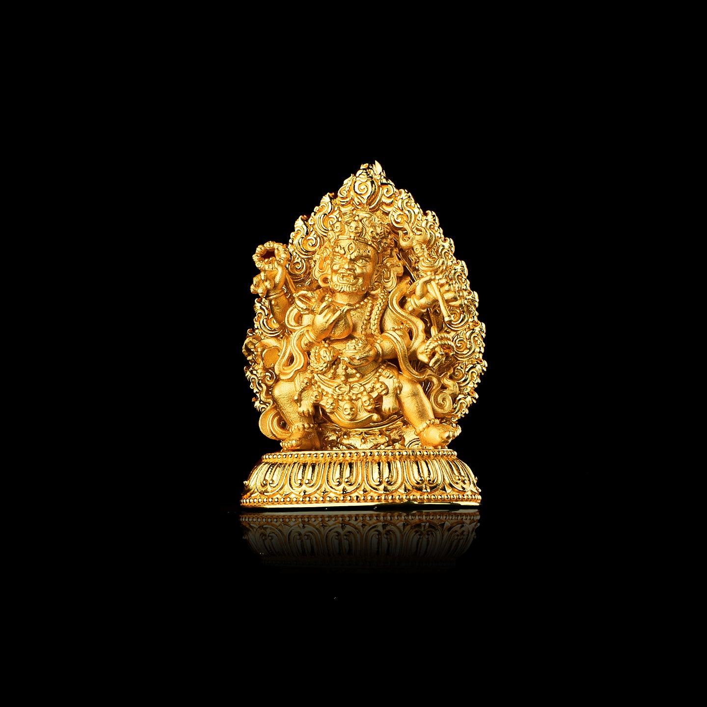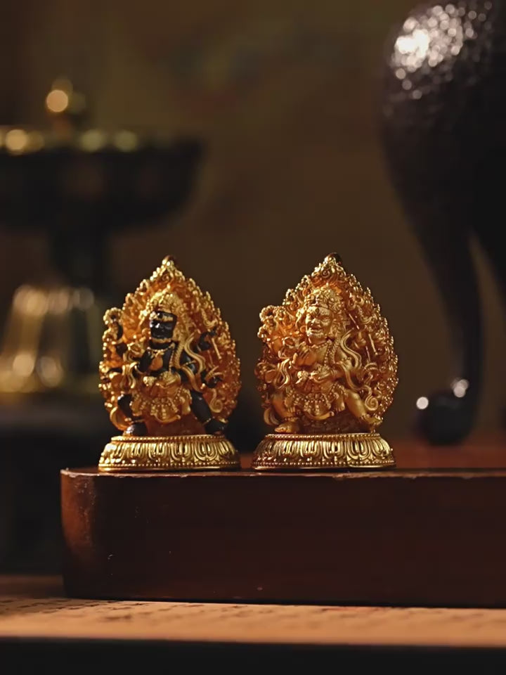 พระพุทธรูปทองคำอันสง่างาม ดุจรัศมีแห่งพระพุทธเจ้าอันรุ่งโรจน์: พระพุทธรูปทองคำอันสง่างามนี้ แหวกแนวจากสีดำแบบดั้งเดิม เป็นสัญลักษณ์ของความสมบูรณ์แบบแห่งพุทธภาวะอันสว่างไสวของพระมหากาล พระพุทธรูปนี้ยึดมั่นในพิธีกรรมการสร้างพระพุทธรูปแบบทิเบตอย่างเคร่งครัด สร้างขึ้นอย่างประณีตบรรจงด้วยดวงตาพิโรธสามดวง (มองเห็นโลกทั้งสาม) พระโอษฐ์และเขี้ยวเล็บขนาดใหญ่ (กลืนกินอวิชชา) สีหน้าดุดัน และมงกุฎกะโหลกห้าหัว (พิชิตพิษทั้งห้า) ตอกย้ำถึงธรรมชาติผู้พิทักษ์