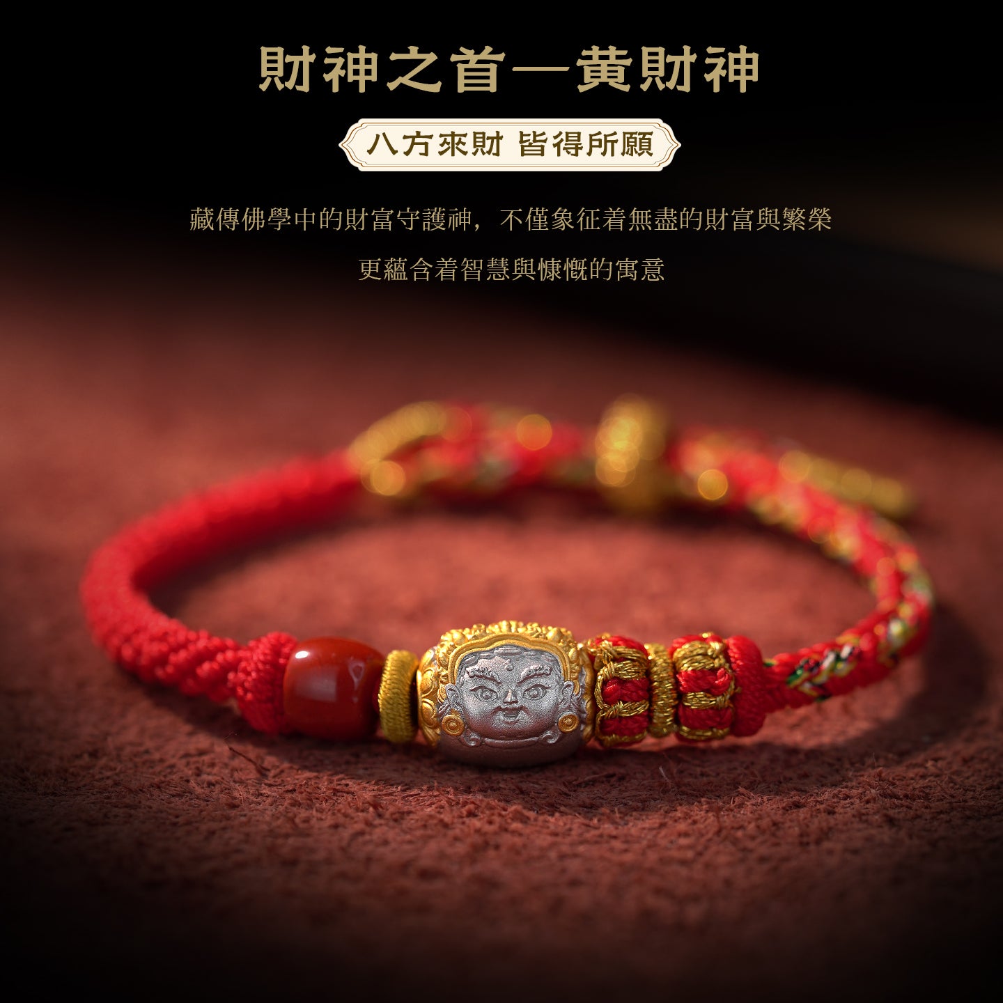 จัมบาลาสีเหลือง เป็นเทพผู้พิทักษ์ความมั่งคั่งอันโดดเด่นในศาสนาพุทธแบบทิเบต เป็นที่รู้จักในนาม "เทพแห่งความมั่งคั่ง" ตามตำนานเล่าว่าพระองค์มีเมตตากรุณา คอยดูแลความมั่งคั่งทางโลกและคุ้มครองผู้ศรัทธา นำพาความเจริญรุ่งเรืองและความมั่งคั่งมาให้ หลุดพ้นจากความยากจน และให้ชีวิตที่อุดมสมบูรณ์และมีความสุข เรื่องราวแห่งการปกป้องคุ้มครองนี้สืบทอดกันมาในหมู่ผู้ศรัทธาชาวทิเบตมานานนับพันปี สร้อยข้อมือเส้นนี้ได้รับแรงบันดาลใจจากภาพคลาสสิกของจัมบาลาสีเหลือง ทำจากเงินสเตอร์ลิง ร้อยด้วยด้ายสีแดงแบบดั้งเดิม สร้อยข้อมือเส้นนี้ผสานพลังการปกป้องคุ้มครองของเทพเจ้าแห่งความมั่งคั่งของทิเบตเข้ากับการสวมใส่ในชีวิตประจำวัน นำพาความปรารถนาอันยาวนานสู่ความมั่งคั่งในชีวิตสมัยใหม่