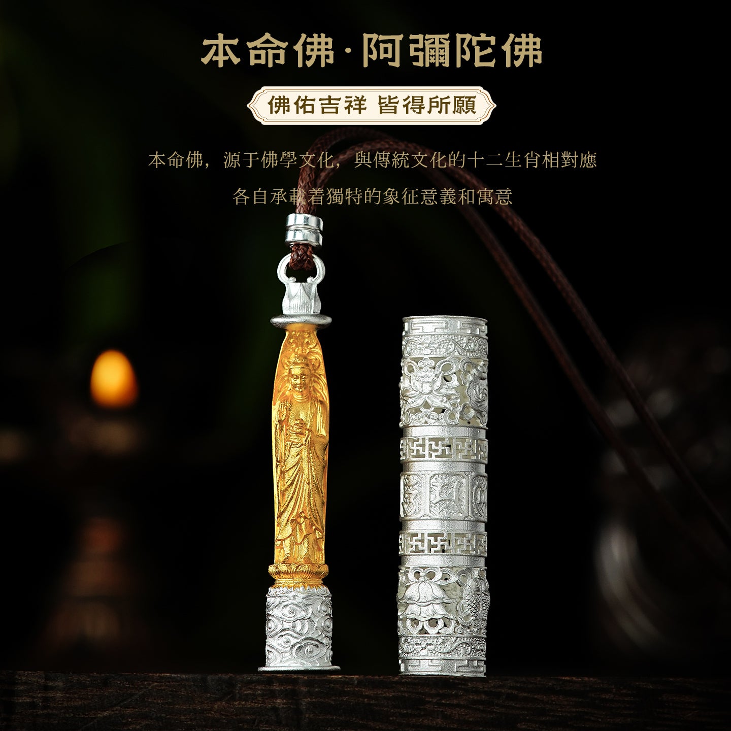พระอมิตาภพุทธ (สันสกฤต: Amitābha) เป็นที่เคารพนับถือในนิกายสุขาวดีในฐานะ "เจ้าแห่งสวรรค์ตะวันตก" ได้รับการกล่าวถึงใน "พระสูตรอมิตาภ" พระสูตรนี้บันทึกคำปฏิญาณอันยิ่งใหญ่ 48 ประการของพระองค์ไว้ว่า "สรรพสัตว์ทั้งปวงในสิบทิศที่ศรัทธาและยินดีในพระนามของเราอย่างจริงใจ จะได้ไปเกิดในสุขาวดี" พระพุทธรูปองค์นี้สร้างขึ้นจากแผนภาพการเปลี่ยนแปลงสุขาวดีของฉางอานในสมัยราชวงศ์ถัง แสดงให้เห็นพระพุทธเจ้าในอิริยาบถที่เปี่ยมด้วยความเมตตา พระบาทประทับบนแท่นทองคำทรงมุทราต้อนรับและดอกบัวพันกลีบ ประดิษฐานอยู่ภายในกระบอกพุทธสีน้ำเงินอันล้ำค่า ประดิษฐานพระปฏิญาณดั้งเดิมของพระพุทธเจ้าที่ว่า "ขอพรจากพระพุทธเจ้าและขอให้พรสำเร็จทุกประการ" ซึ่งสอดคล้องกับประเพณีพื้นบ้านของ "พระพุทธเจ้าประสูติ-ประสูติ" (หมายเหตุ: ราศีที่ตรงกันเป็นส่วนขยายทางวัฒนธรรม)