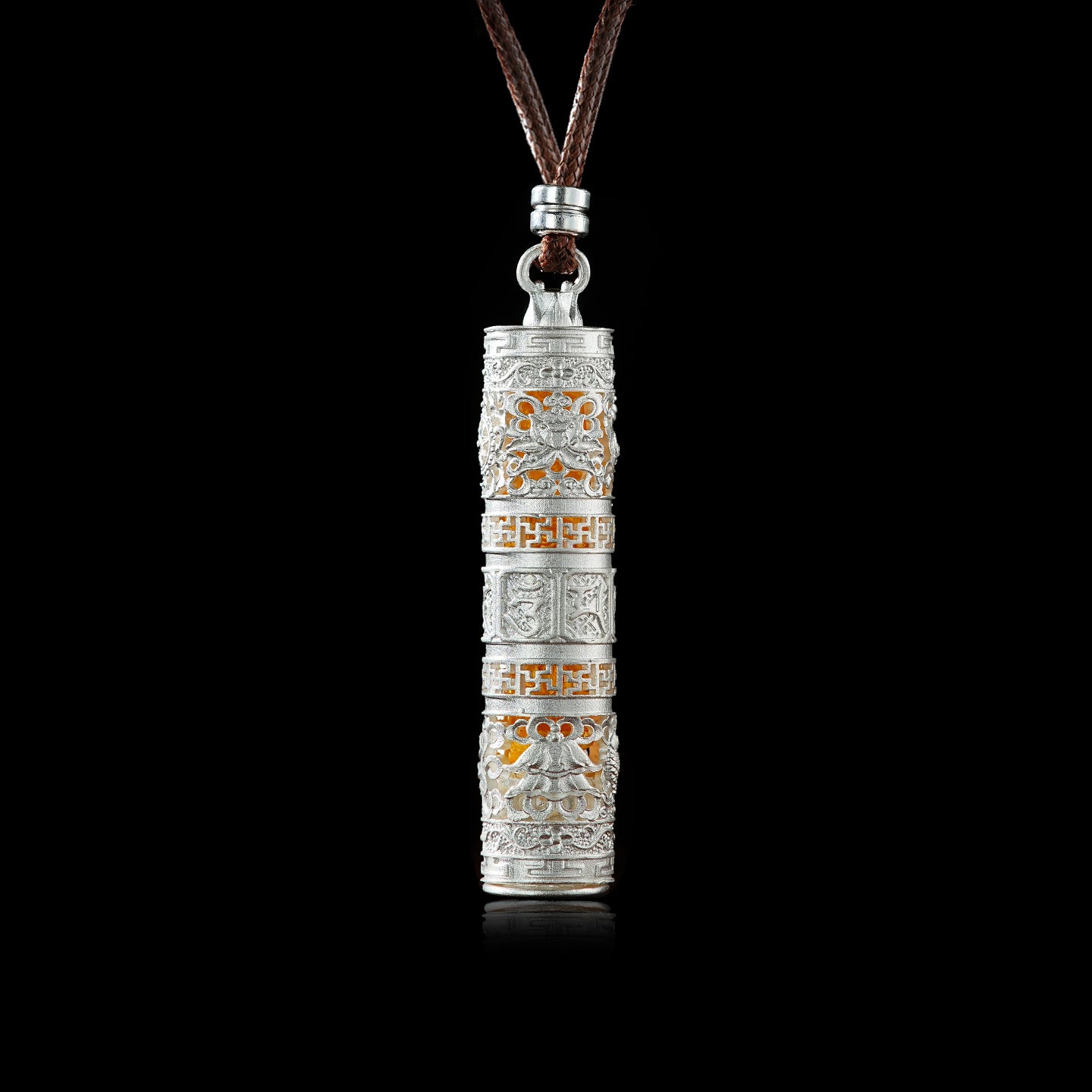 พระอมิตาภพุทธเจ้าทรงเป็นจุดหมายปลายทางสูงสุดของพระพุทธศาสนานิกายสุขาวดีในพุทธศาสนาจีน ตราประทับแห่งการนำทางของพระองค์เป็นสัญลักษณ์ของการโอบกอดด้วยความเมตตา แม้กระทั่งผู้ที่มีจิตใจต่ำต้อยที่สุด พระองค์ทรงเป็นที่เคารพนับถือของผู้คนในฐานะแหล่งแห่งความสงบสุขและความมั่นคงทั้งในโลกนี้และโลกหน้า พระพุทธรูปทรงกระบอกนี้ผสมผสานภาพสุขาวดีสมัยราชวงศ์ถัง เทคนิคการสวดภาวนา และการฝึกเวียนรอบจิต เปลี่ยนแปลงแนวคิดอันลึกซึ้งเกี่ยวกับการหลุดพ้นด้วยพลังของผู้อื่นให้กลายเป็นภาชนะแห่งธรรมะพกพา สิ่งสำคัญที่ต้องจำไว้คือ แม้แสงสว่างของพระพุทธเจ้าจะส่องสว่างไปทั่วทุกหนแห่ง แต่ท้ายที่สุดแล้ว แสงสว่างนั้นต้องอาศัยศรัทธาและความปรารถนาของตนเองในฐานะผู้นำทาง มีเพียงความคิดอันบริสุทธิ์เท่านั้นที่จะนำมาซึ่งความสุขและความผาสุกอย่างแท้จริง (หมายเหตุ: พระคัมภีร์ทางพุทธศาสนาไม่ได้สัมพันธ์โดยตรงกับรูปเคารพและราศีของพระพุทธเจ้า นี่เป็นเพียงประเพณีพื้นบ้าน)